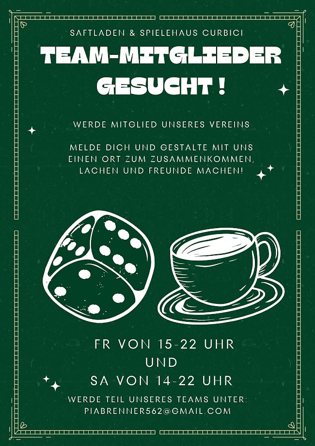 Der zukünftige Verein "Saftladen und Spielecafé Curbici e.V." sucht auch gern noch weitere Mitglieder. Sofern Ihr also Spaß und Freude an diesem Vorhaben hättet, dann meldet euch einfach unter cafecurbici@gmail.com.